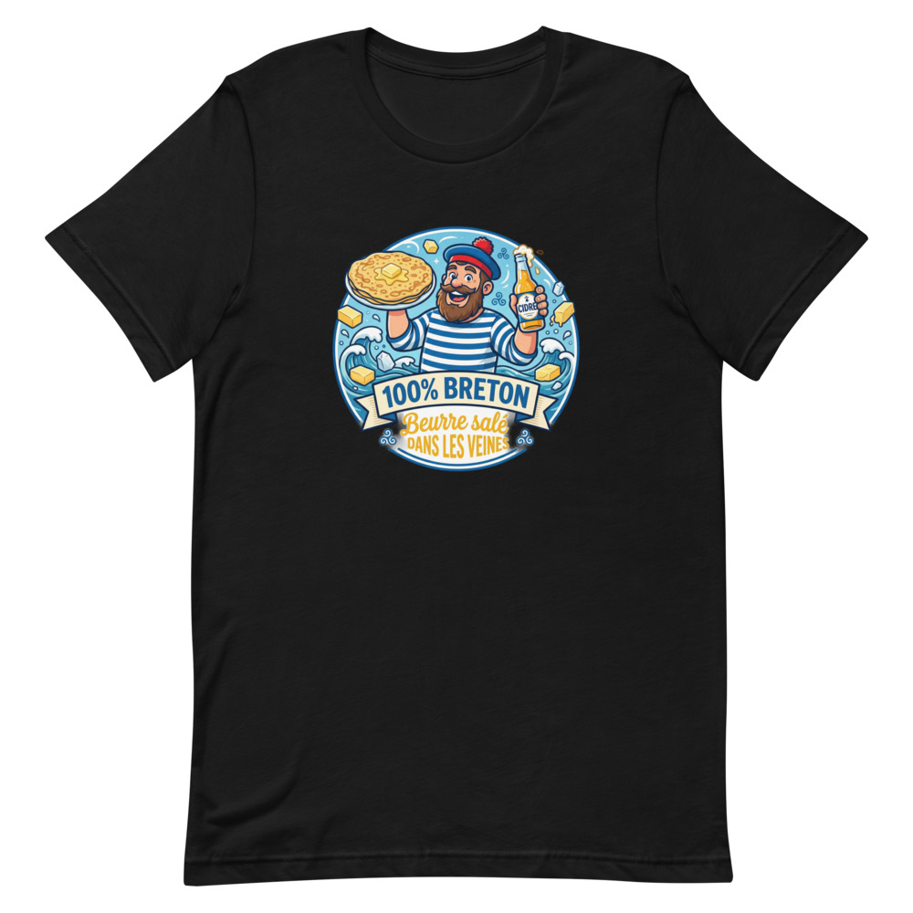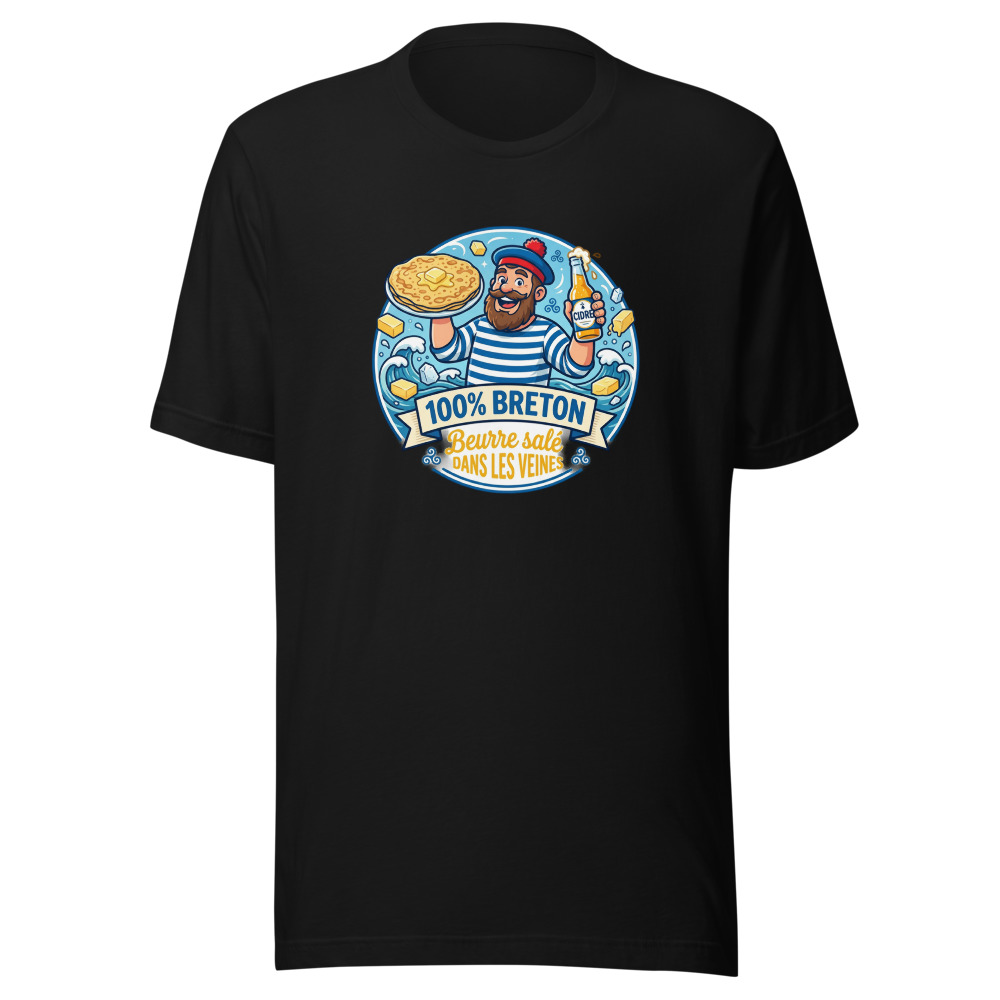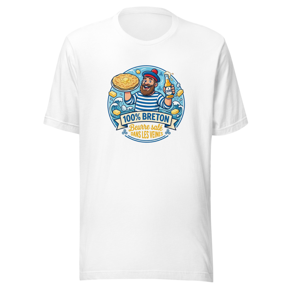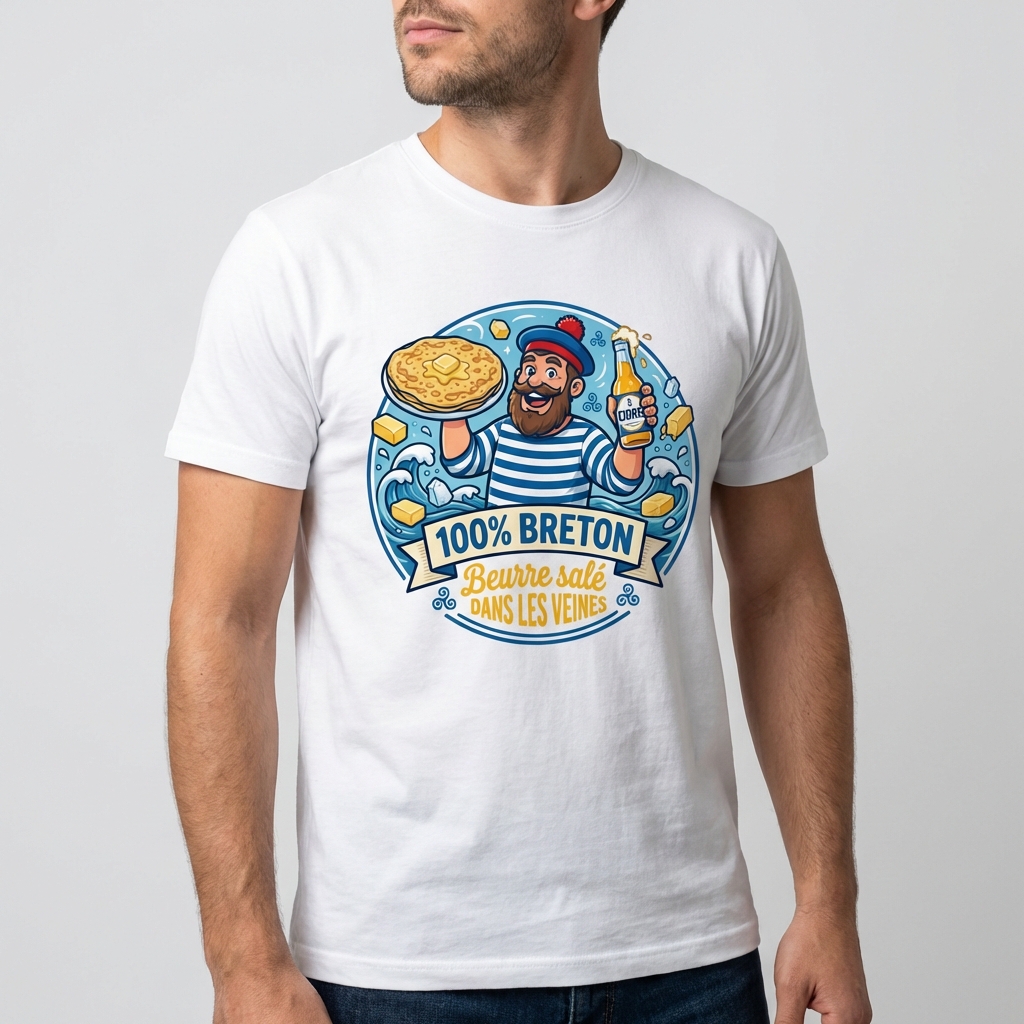 Être Breton, ce n’est pas seulement une question de géographie, c’est un état d’esprit… et surtout un régime alimentaire ! Vous ne pouvez pas imaginer un repas sans une touche de sel de Guérande ou une bonne galette ? Alors ce t-shirt est fait pour vous. Avec son slogan « 100% Breton Beurre Salé dans les Veines », il annonce la couleur dès le premier coup d’œil.