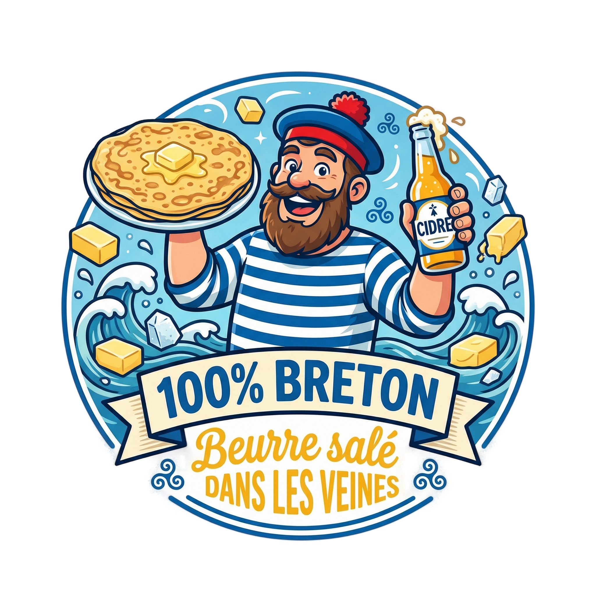 Le design style cartoon apporte une touche de légèreté et d’humour irrésistible. On y retrouve tous les codes qui font la fierté de la région : l’esprit marinière, la convivialité du cidre et la gourmandise de la crêpe. C’est le vêtement idéal pour vos sorties en bord de mer, vos festivals celtiques ou simplement pour revendiquer votre identité au quotidien, que vous soyez à Rennes, Brest ou exilé à Paris.