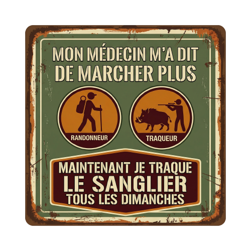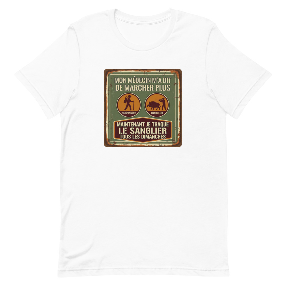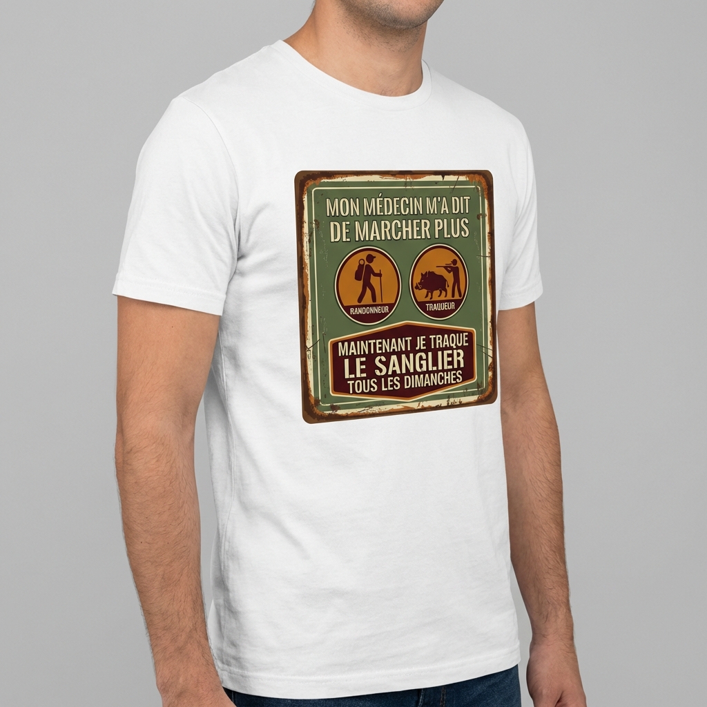 Votre médecin vous a conseillé de faire un peu plus d’exercice pour prendre soin de votre santé ? Il ne pensait probablement pas que vous prendriez ses recommandations au pied de la lettre en arpentant les fourrés les plus denses à la recherche du grand noir ! Notre t-shirt exclusif « Mon médecin m’a dit de marcher plus. Maintenant je traque le sanglier tous les dimanches » est le clin d’œil parfait pour tous les traqueurs, piqueux et passionnés de chasse au sanglier. Que vous soyez un habitué de la battue, un adepte de la chasse devant soi ou simplement un amoureux des sorties en pleine nature, ce vêtement exprime votre passion avec une touche d’ironie irrésistible qui fera mouche auprès de vos amis chasseurs.
