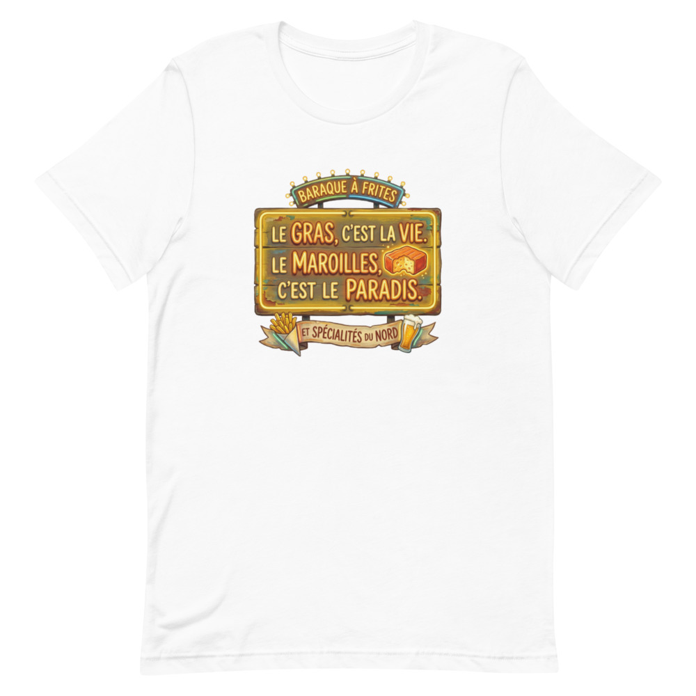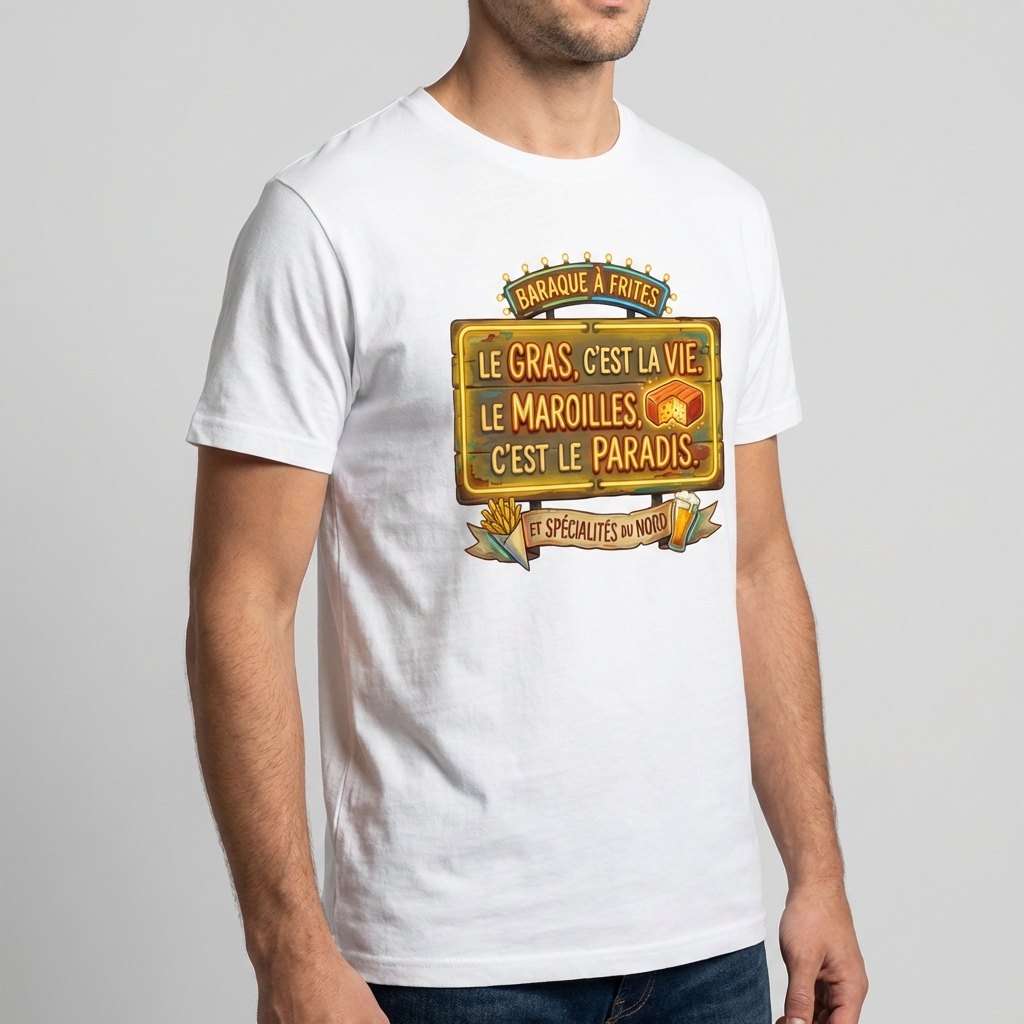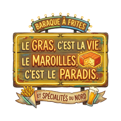 Le visuel de ce t-shirt s’inspire directement de l’esthétique iconique des friteries traditionnelles. Avec son lettrage peint à la main et son effet néon jaune moutarde, il rappelle les enseignes lumineuses qui réchauffent le cœur lors des soirées fraîches sur la place du village. Le slogan ‘Le gras, c’est la vie. Le Maroilles, c’est le paradis’ est une véritable déclaration d’amour à notre fromage local le plus célèbre. C’est le mélange parfait entre nostalgie rétro et humour moderne, idéal pour ceux qui ne se prennent pas au sérieux.