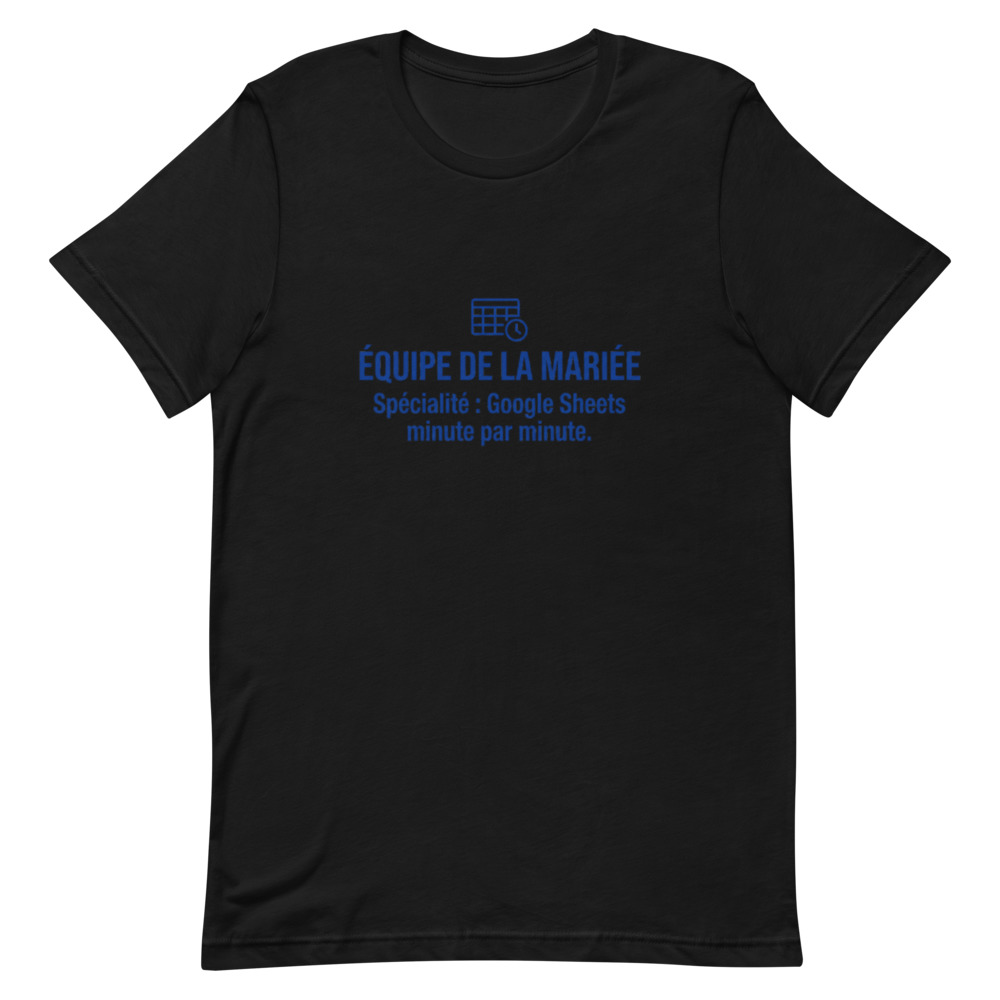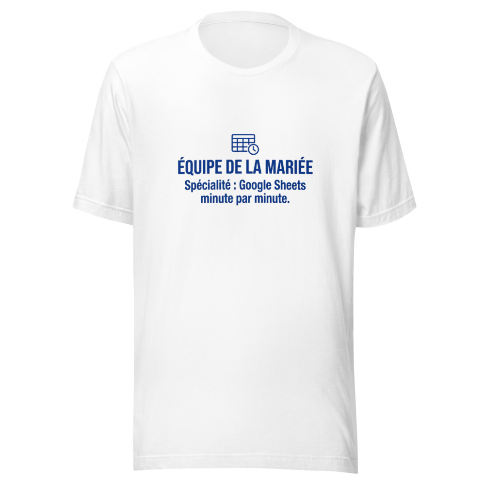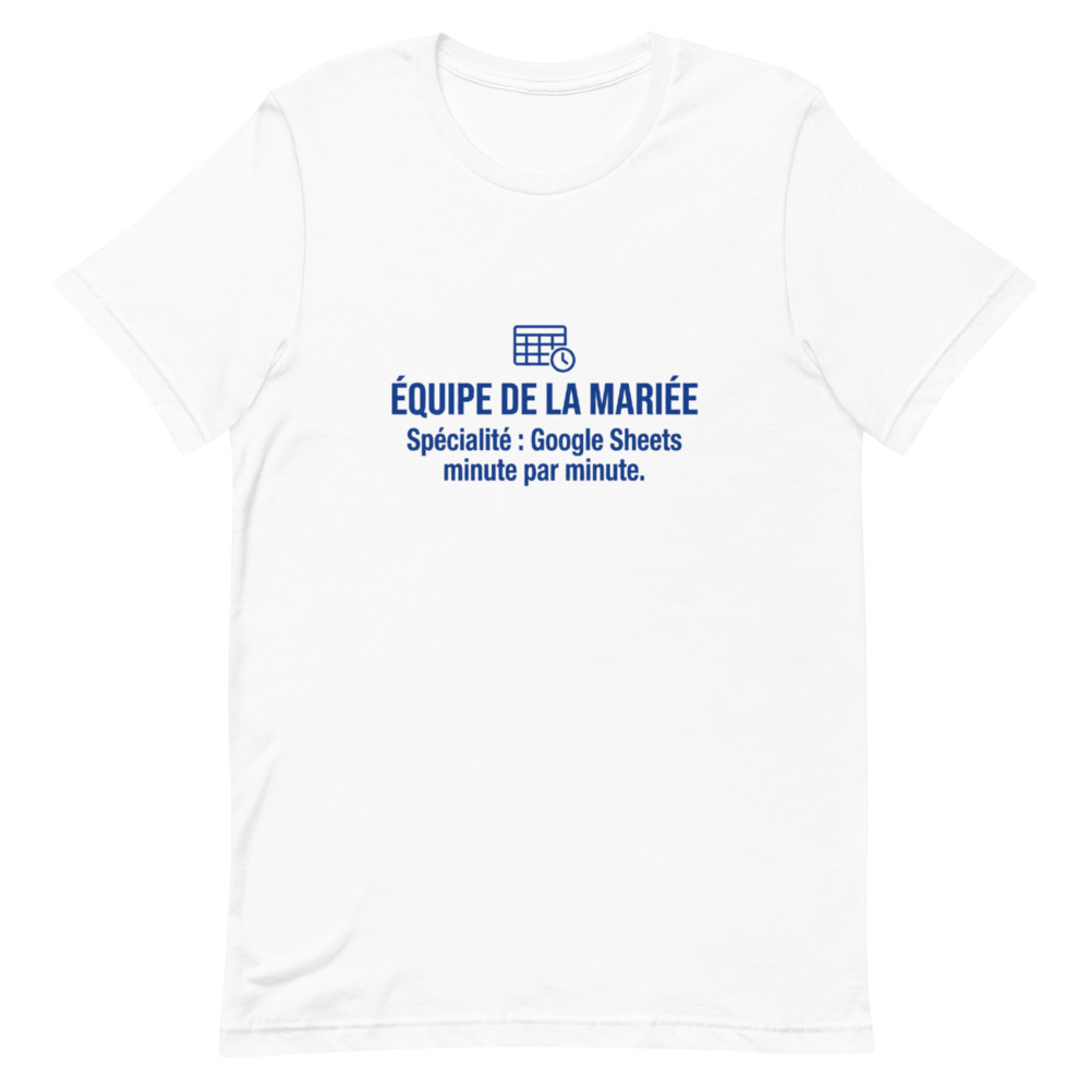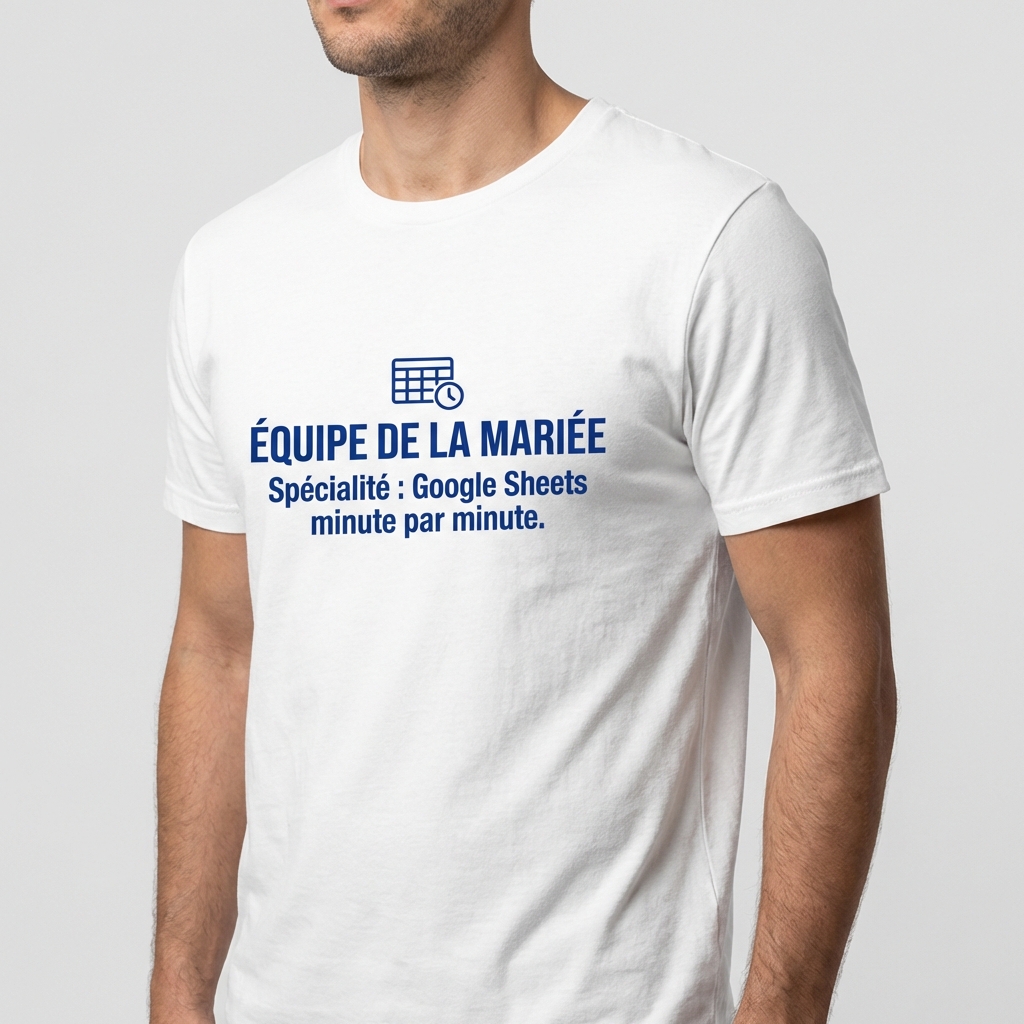 L’organisation d’un Enterrement de Vie de Jeune Fille (EVJF) est une mission de haute voltige qui demande de la rigueur, de la patience et surtout… un tableau Google Sheets parfaitement structuré. Vous êtes la témoin ou la demoiselle d’honneur qui gère les imprévus comme une pro ? Ce t-shirt « Équipe de la Mariée – Spécialité : Google Sheets minute par minute » est votre nouvel uniforme officiel. Conçu pour celles qui ne laissent aucune place au hasard, il allie humour, style minimaliste et une pointe de fierté pour votre sens de l’organisation légendaire.