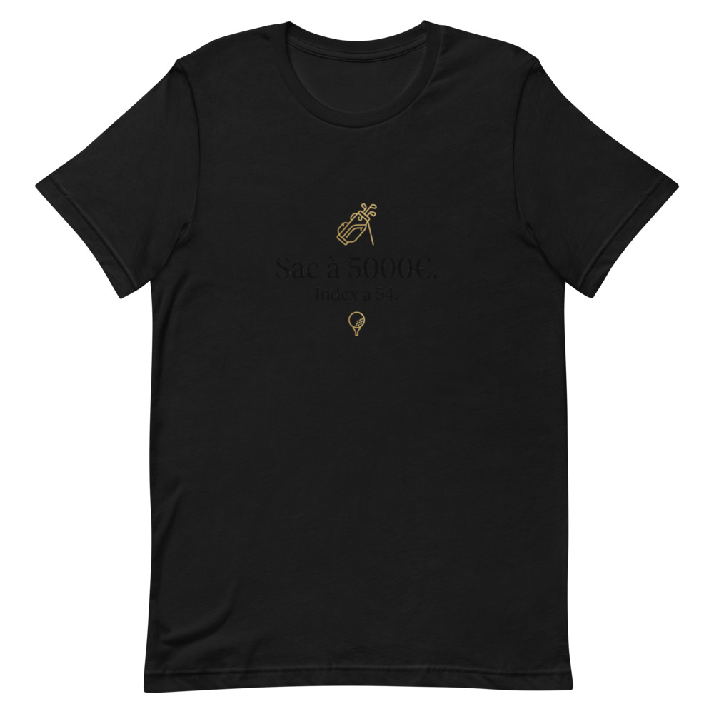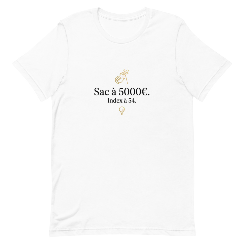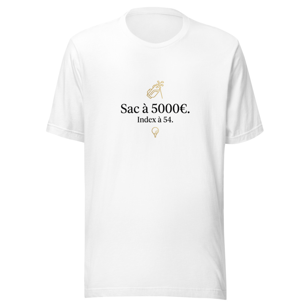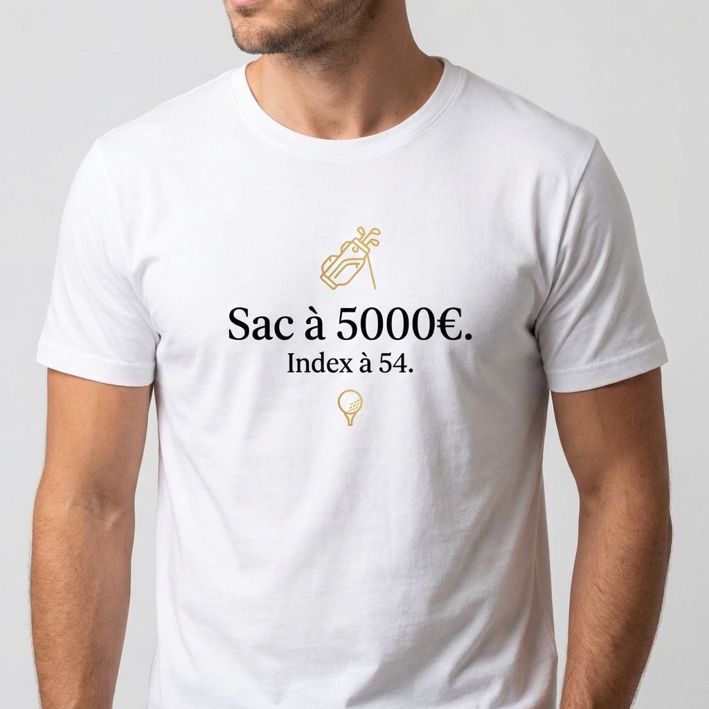 Vous connaissez ce golfeur qui arrive sur le parking du club avec la dernière série de fers TaylorMade, un putter Scotty Cameron à 500€ et un sac de luxe flambant neuf, mais qui gratte sa balle dès le trou n°1 ? Ce golfeur, c’est peut-être vous, et c’est totalement assumé ! Notre t-shirt ‘Sac à 5000€. Index à 54.’ célèbre l’amour du beau matériel de golf, même quand le handicap ne suit pas encore. C’est l’essence même de l’autodérision chic sur le fairway.