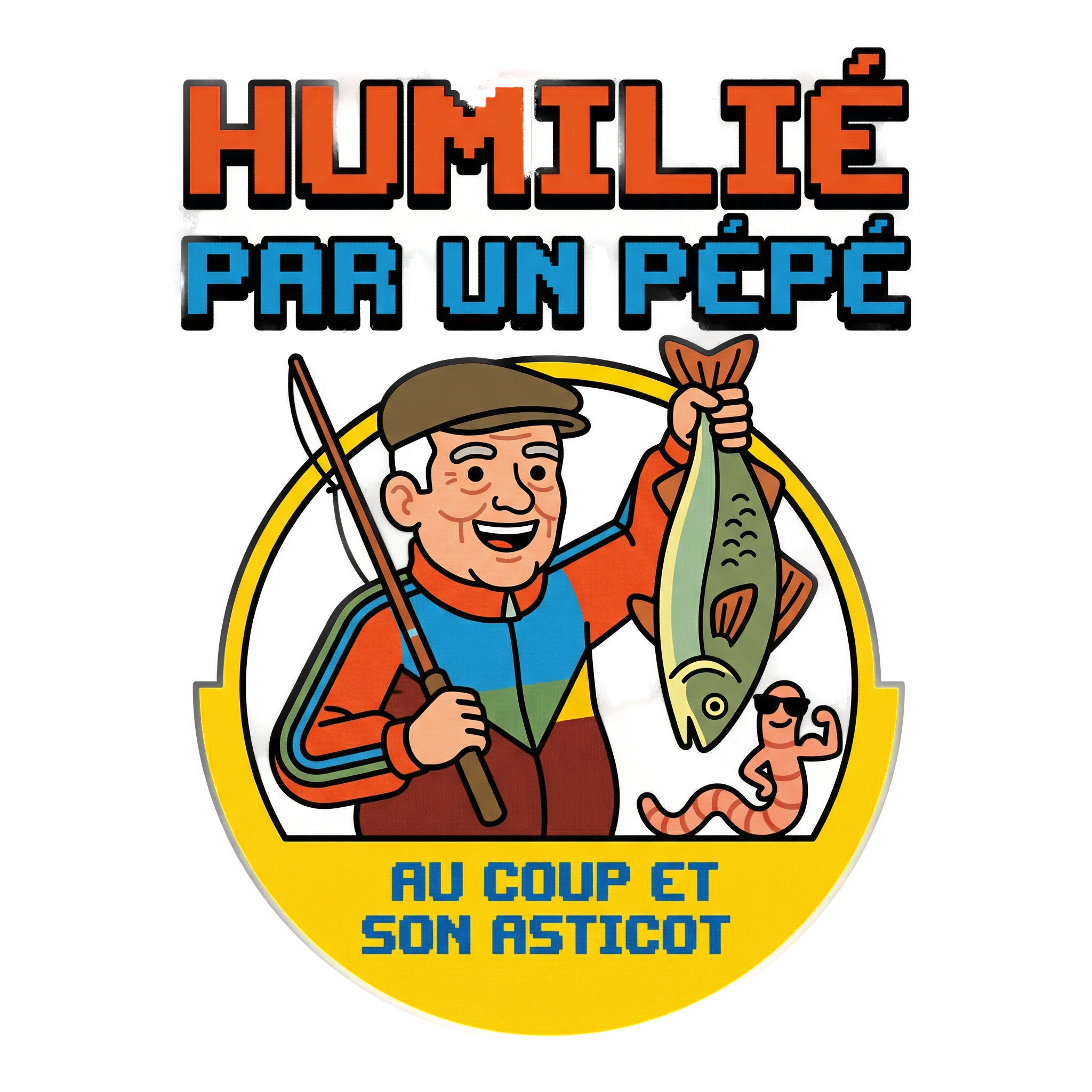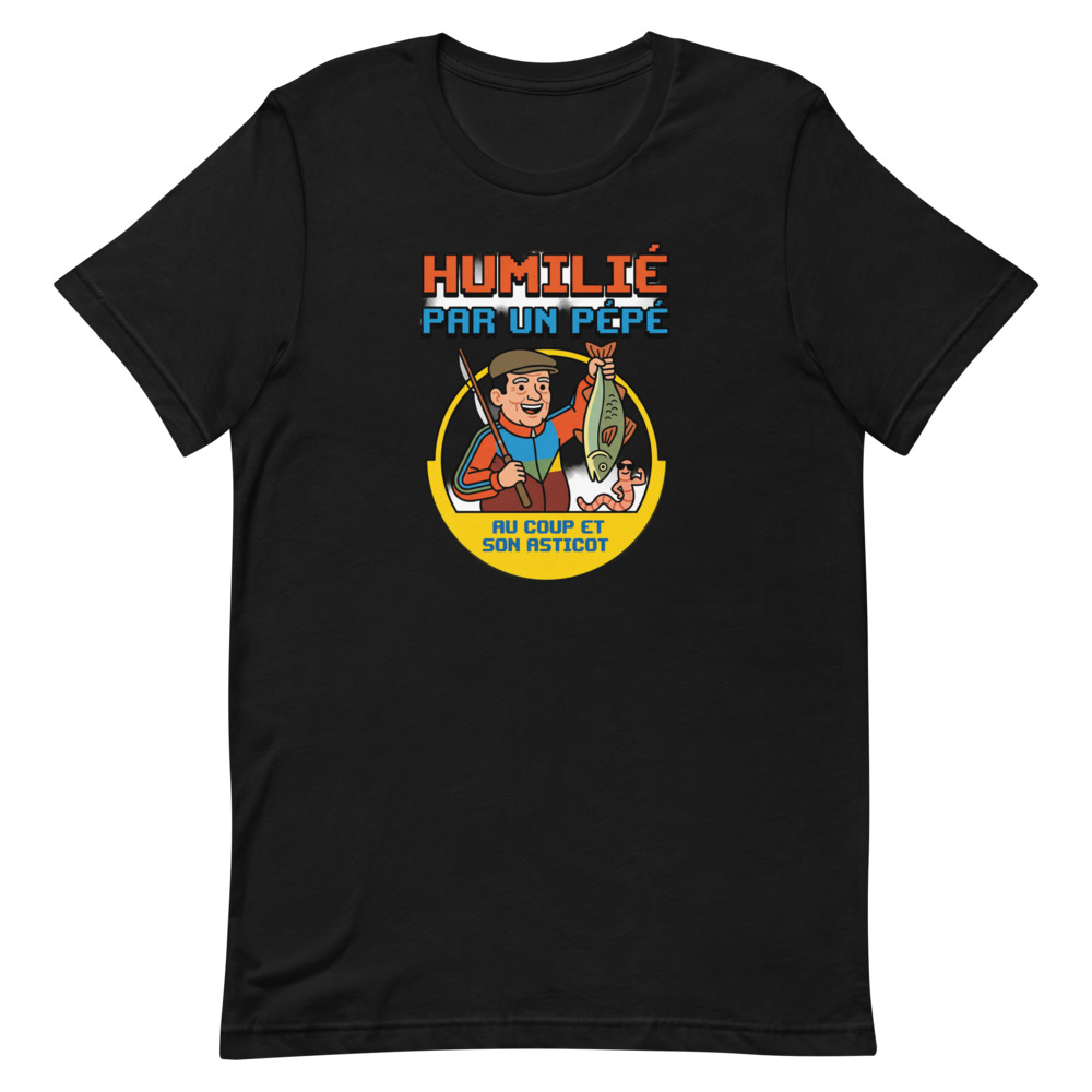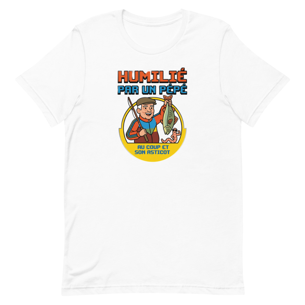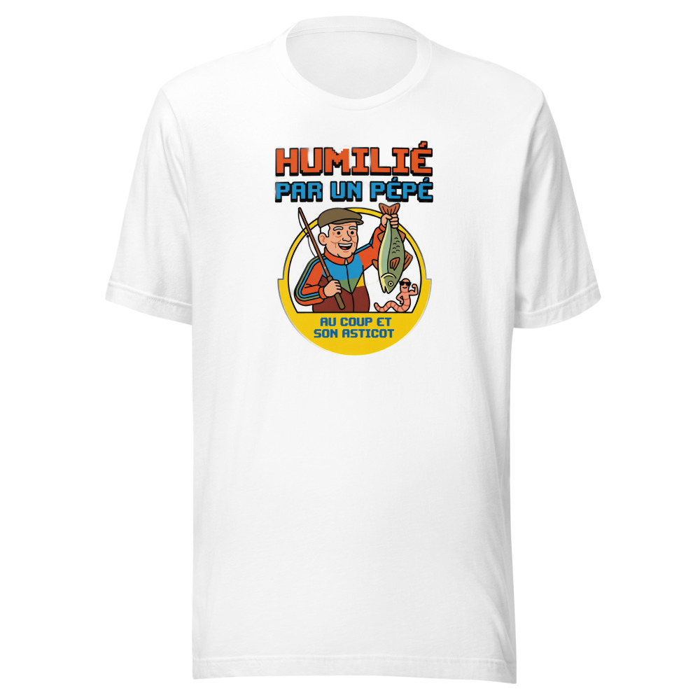 Ce t-shirt « Humilié par un pépé au coup et son asticot » est un hommage hilarant à cette leçon d’humilité que la pêche nous enseigne parfois. Avec son design rétro kitsch façon publicité des années 80, il capture l’essence de la vieille école et de la pêche au coup traditionnelle. C’est le vêtement idéal pour afficher votre autodérision et partager un bon rire avec vos collègues pêcheurs au bord de l’étang ou de la rivière.