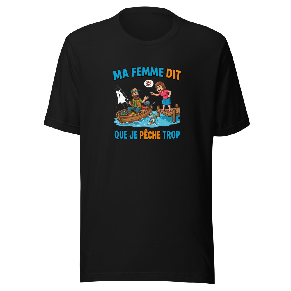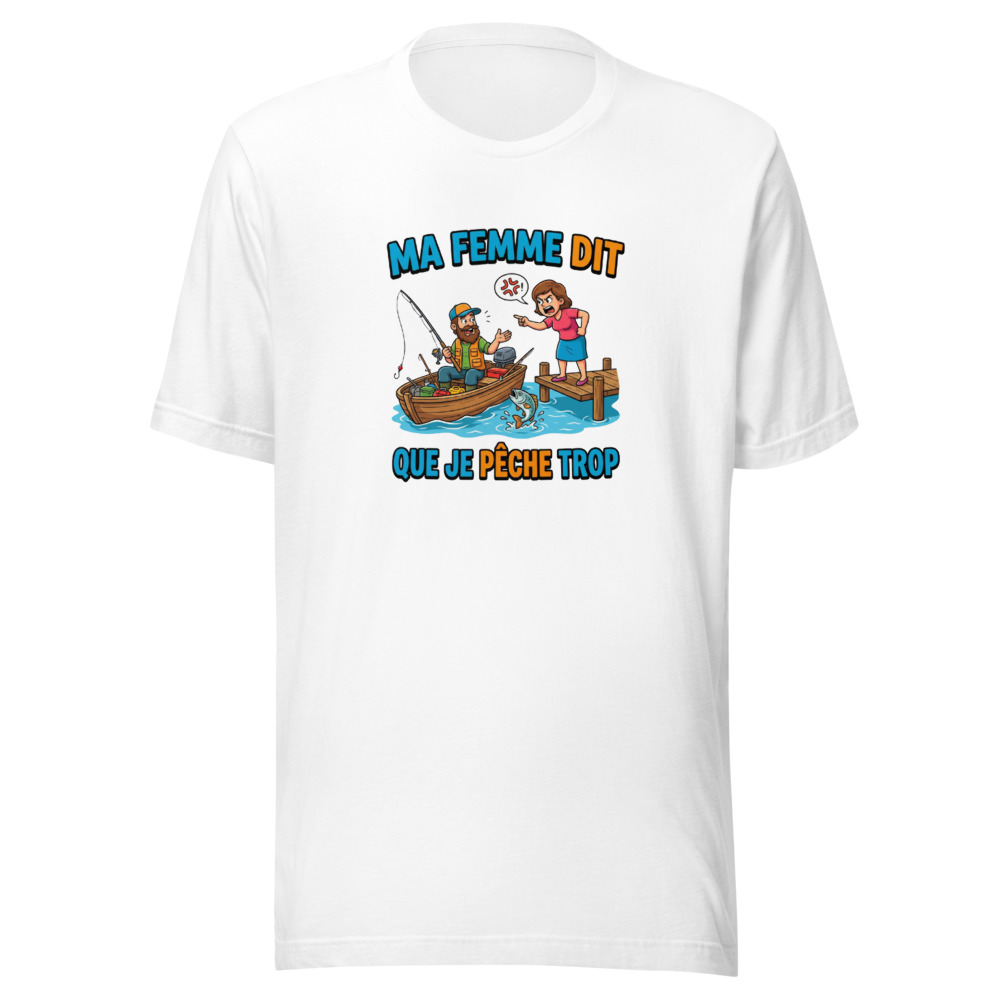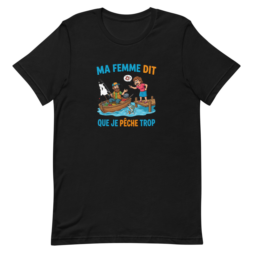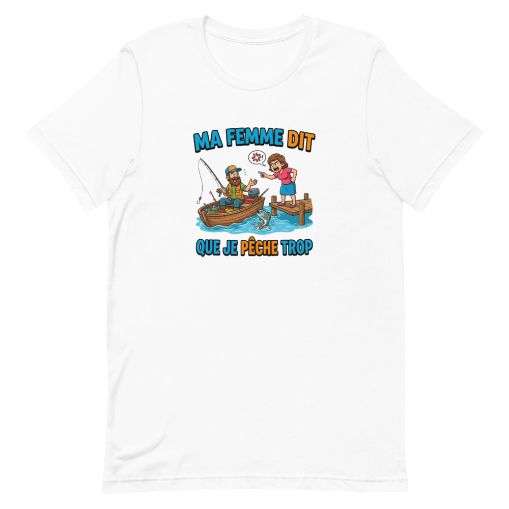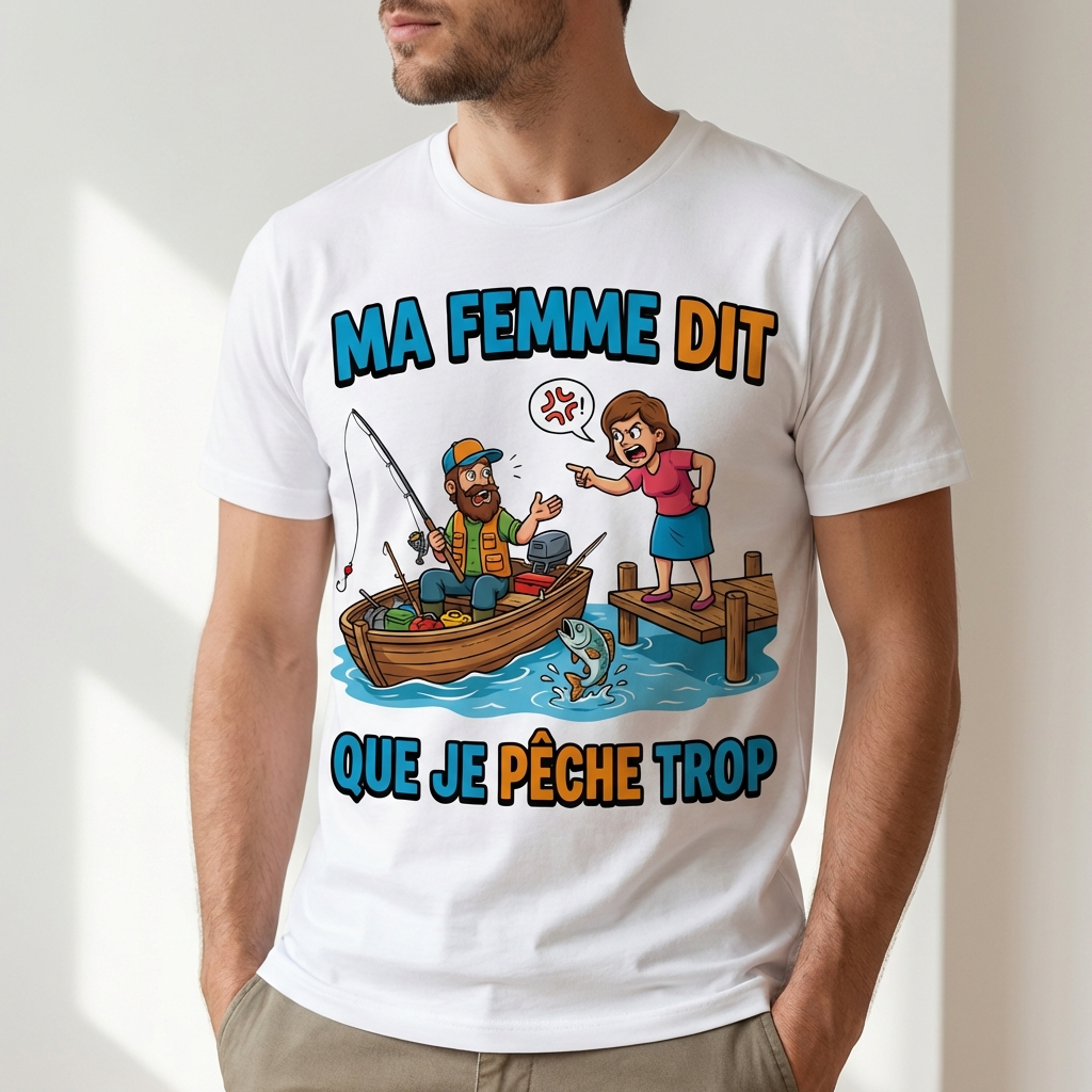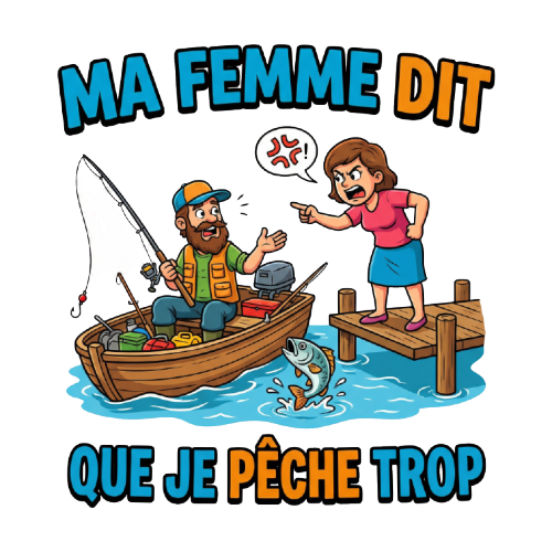 Vous connaissez parfaitement cette situation : le réveil n’a pas encore sonné que vous êtes déjà en train de vérifier vos bas de ligne et de trier vos leurres. Alors que vous vous glissez discrètement hors de la chambre, vous entendez cette phrase devenue mythique : « Tu ne vas pas encore à la pêche ? ». Si cette scène fait partie de votre quotidien, notre t-shirt exclusif « Ma Femme Dit Que Je Pêche Trop » est fait pour vous ! C’est bien plus qu’un simple vêtement, c’est un badge d’honneur pour tous ceux qui préfèrent le clapotis de l’eau au bruit de la télévision. Ce t-shirt capture avec autodérision l’éternelle négociation entre la passion dévorante du grand air et la vie de famille.