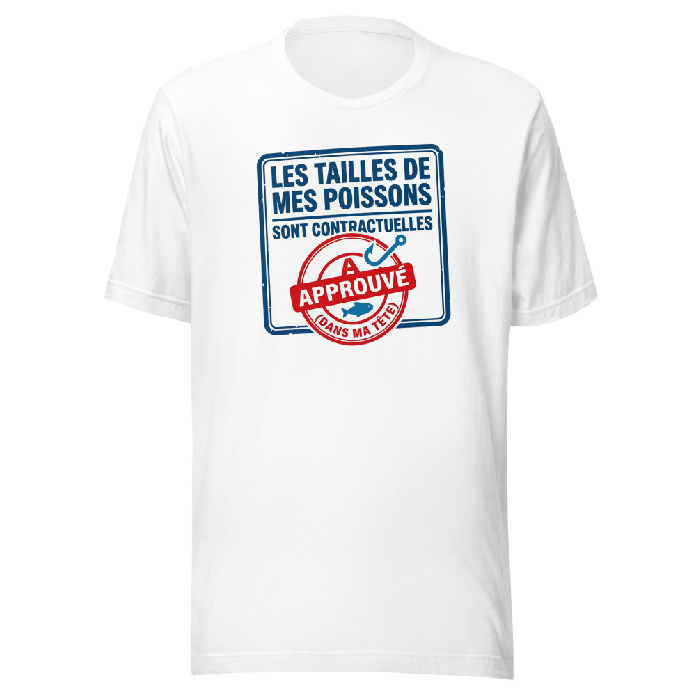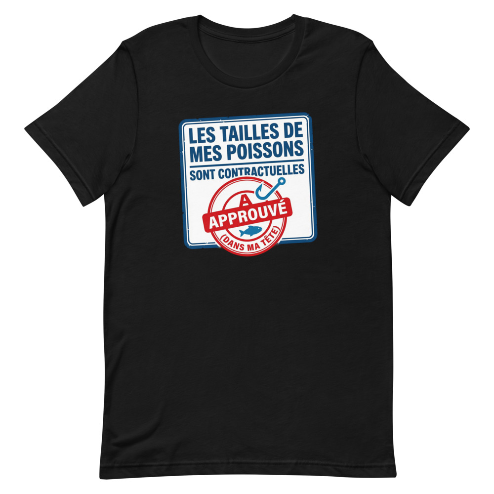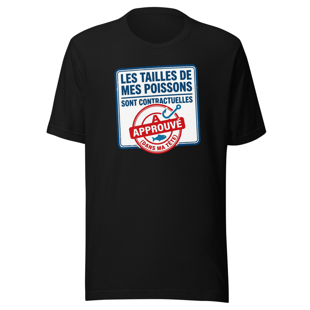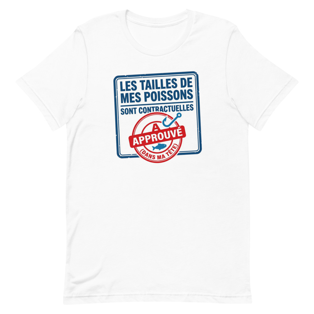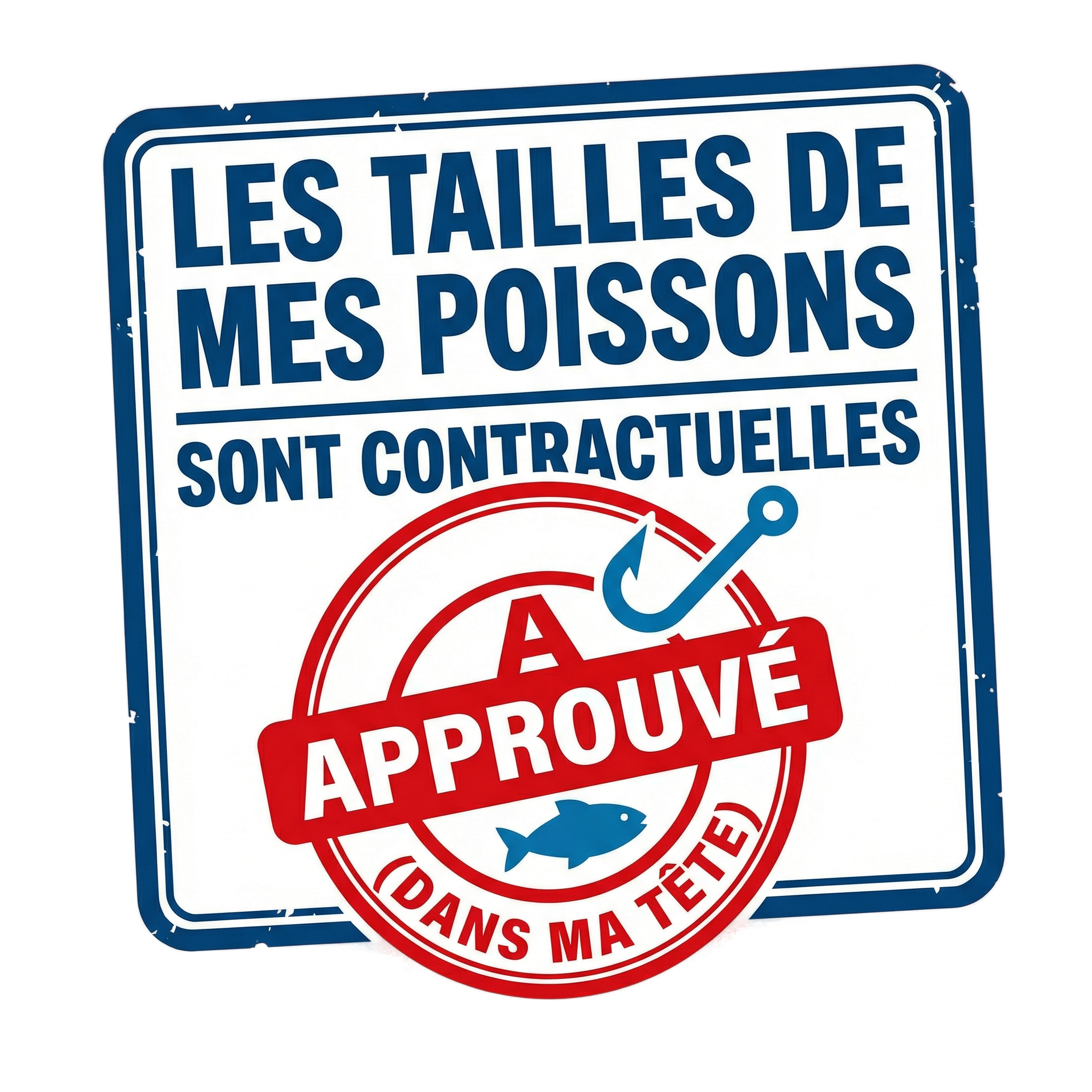Avec son slogan hilarant « Les tailles de mes poissons sont contractuelles (dans ma tête) » imprimé dans un style tampon administratif officiel, ce vêtement officialise enfin la mauvaise foi légendaire des pêcheurs. C’est bien plus qu’un simple habit, c’est une déclaration d’humour qui fera sourire tous vos collègues au bord de l’étang ou sur le bateau.