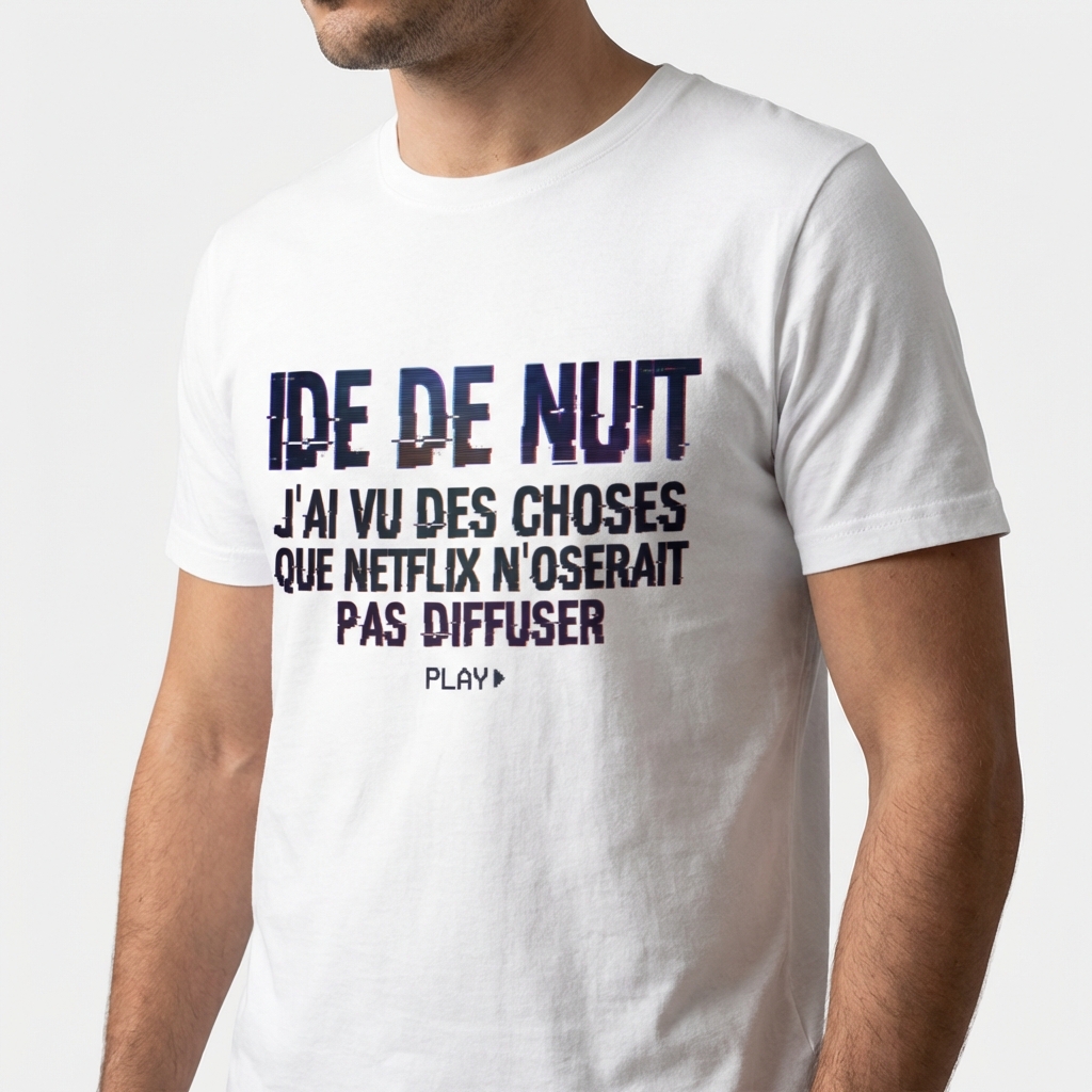 Ce t-shirt ne se contente pas de porter un message fort, il affiche un look rĂ©solument moderne. Le design s’inspire de l’esthĂ©tique du streaming vidĂ©o avec une typographie volontairement dĂ©formĂ©e, crĂ©ant un effet ‘glitch’ (bug numĂ©rique) qui rappelle les Ă©crans de dĂ©marrage de vos plateformes prĂ©fĂ©rĂ©es. Les couleurs sombres et l’aspect contrastĂ© soulignent l’ambiance nocturne de vos gardes tout en restant ultra-tendance pour la vie de tous les jours.
