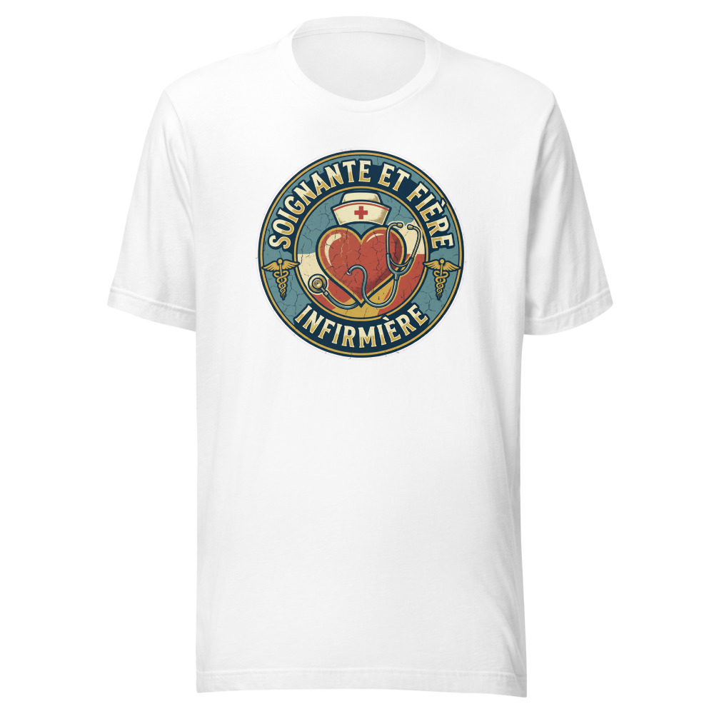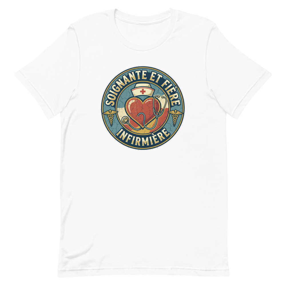 Être infirmière ou soignante, ce n’est pas juste un métier, c’est une mission de vie qui demande courage, empathie et résilience. Avec notre t-shirt Soignante et Fière, affichez cette passion qui vous anime au quotidien. Le design, inspiré des badges vintage rétro, met en avant un cœur symbolique entouré d’une typographie élégante qui rappelle l’authenticité de votre engagement. Ce n’est pas seulement un vêtement, c’est un étendard pour toutes celles qui parcourent les couloirs de l’hôpital jour et nuit pour prendre soin des autres.