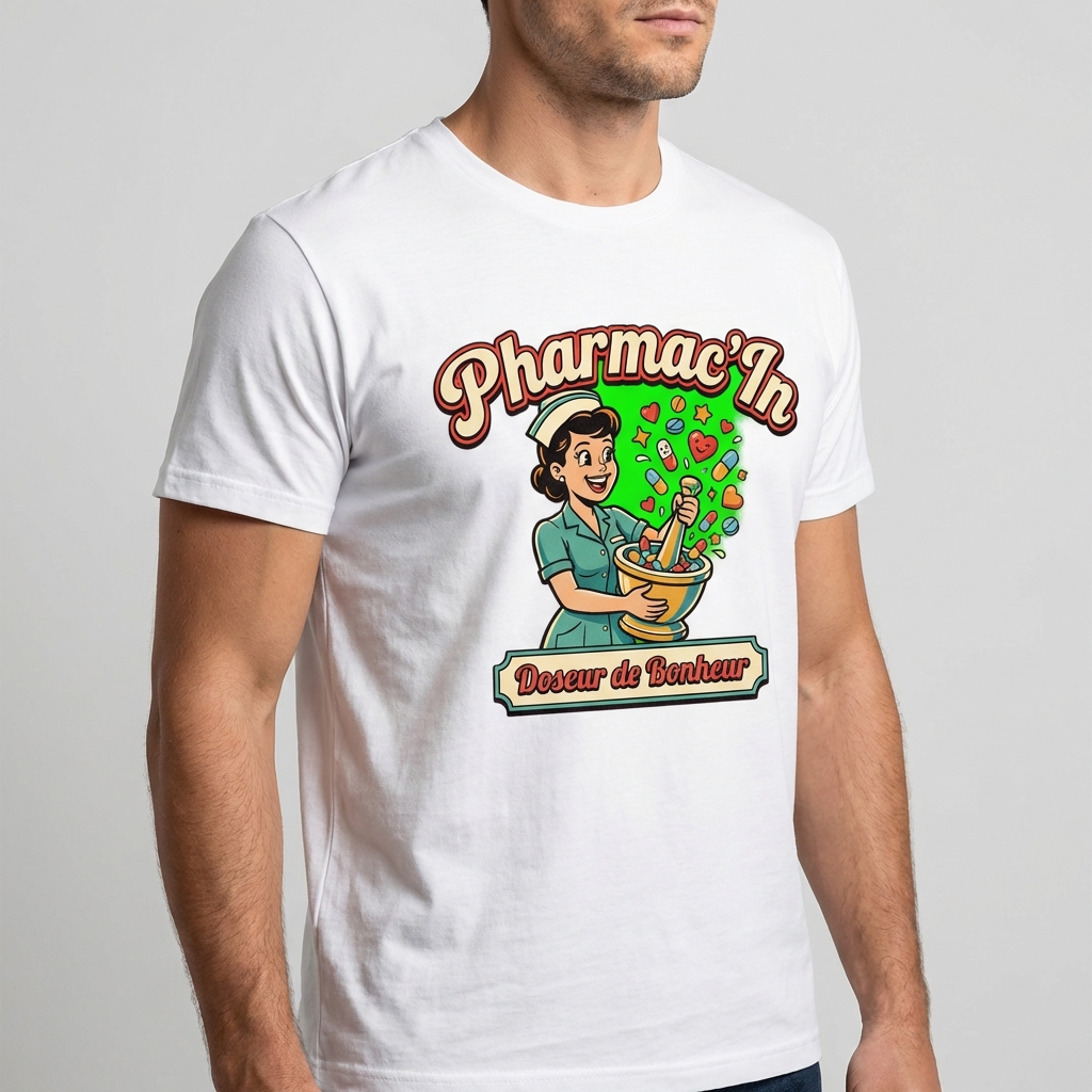 Le métier de pharmacien ou de préparateur en pharmacie n’est pas de tout repos. Entre les gardes, les ordonnances complexes et le conseil aux patients, il est essentiel de garder le sourire. Avec son slogan accrocheur « Pharmac’In Doseur de Bonheur » et son illustration style cartoon rétro (mettant en scène pilules et mortier), ce vêtement apporte une touche de légèreté indispensable.