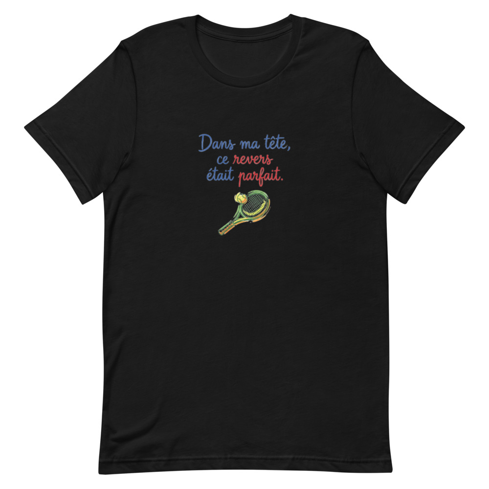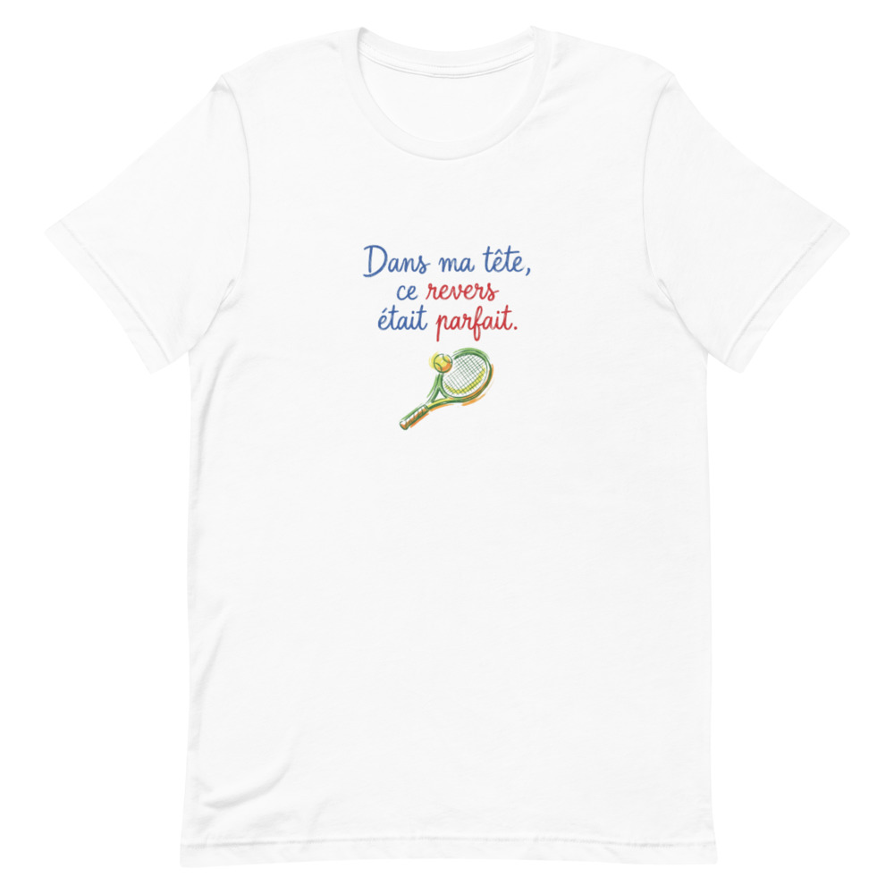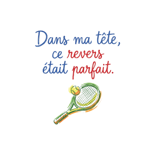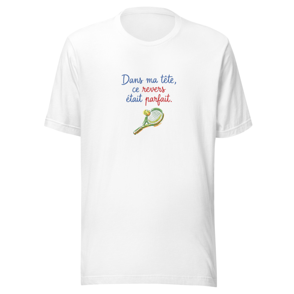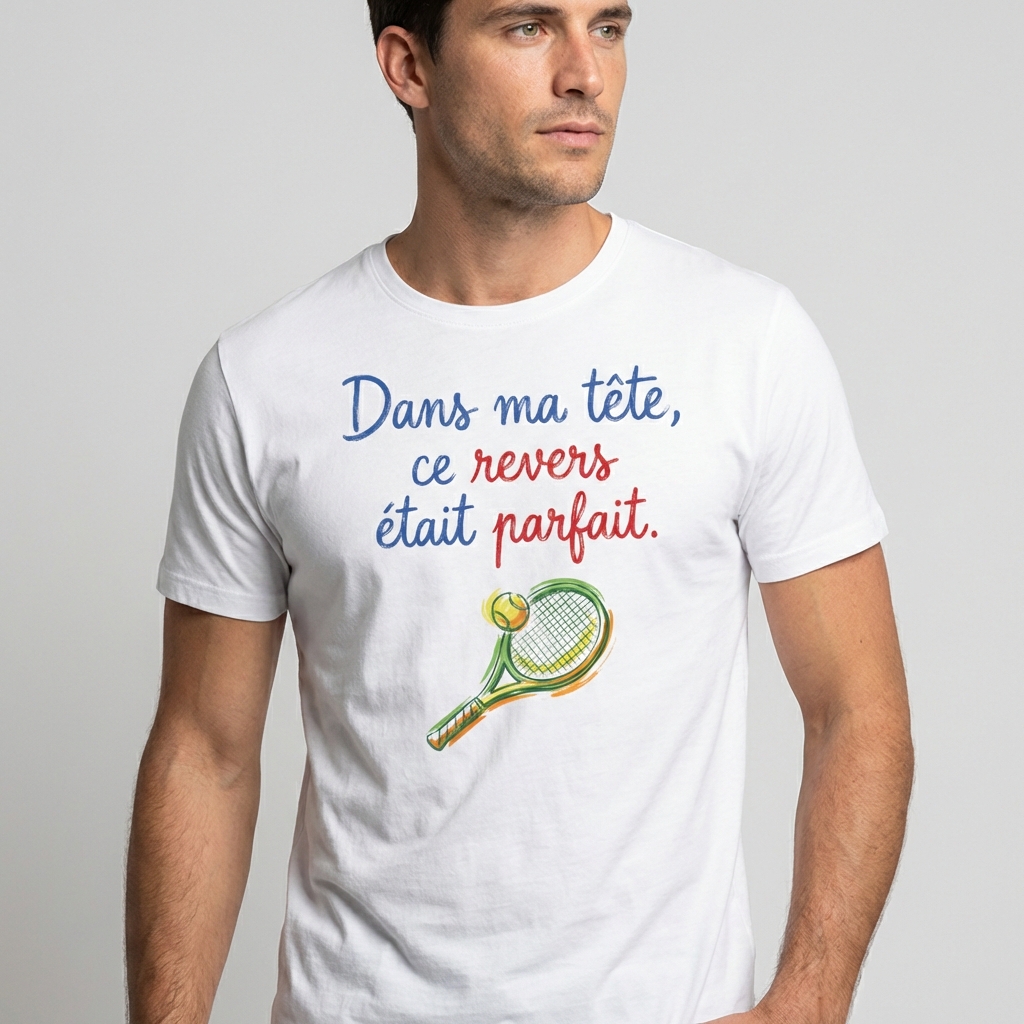 On a tous connu ce moment : la balle arrive parfaitement sur le revers, on s’imagine déjà claquer un passing-shot digne de Roger Federer, et finalement… la balle finit dans le bas du filet ou chez le voisin du court n°4. C’est pour célébrer ces moments de solitude et de génie incompris que nous avons créé ce t-shirt exclusif avec le slogan : « Dans ma tête, ce revers était parfait. »